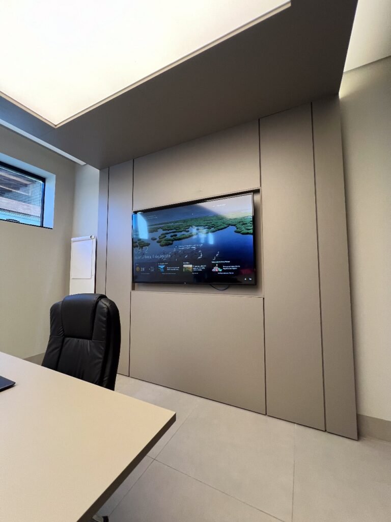 Estrutura: Mesa oval, TV, frigobar, armários e gavetas em painel
